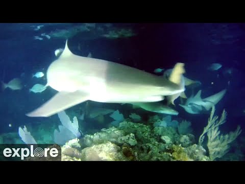 これらの3台のカメラは、岸から175フィート離れたドックの端、水深10フィートのところに設置されており、ドック前の浅いリーフを180度見渡すことができる。日中は典型的なカリブ海のリーフフィッシュを見ることができ、日没後はサメがドック周辺を旋回します。